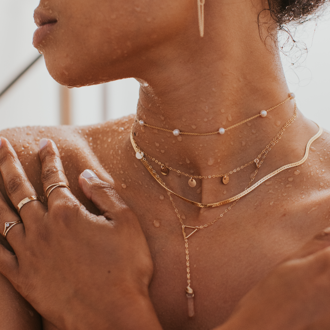 • Layering Necklaces: Vary lengths, chain thickness, and weight of pendants. This will overall help with tangling when layering necklaces.