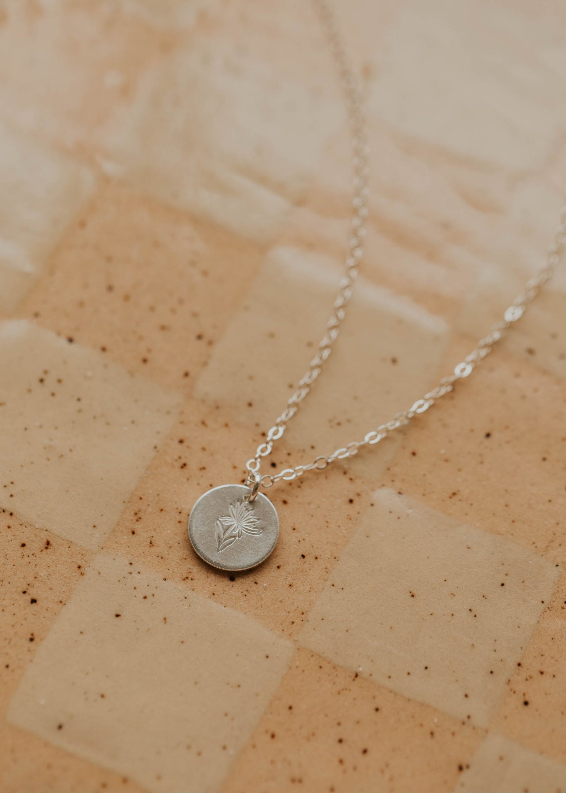• Hand-drawn birth flower pendant on our delicate chain or zoey chain.