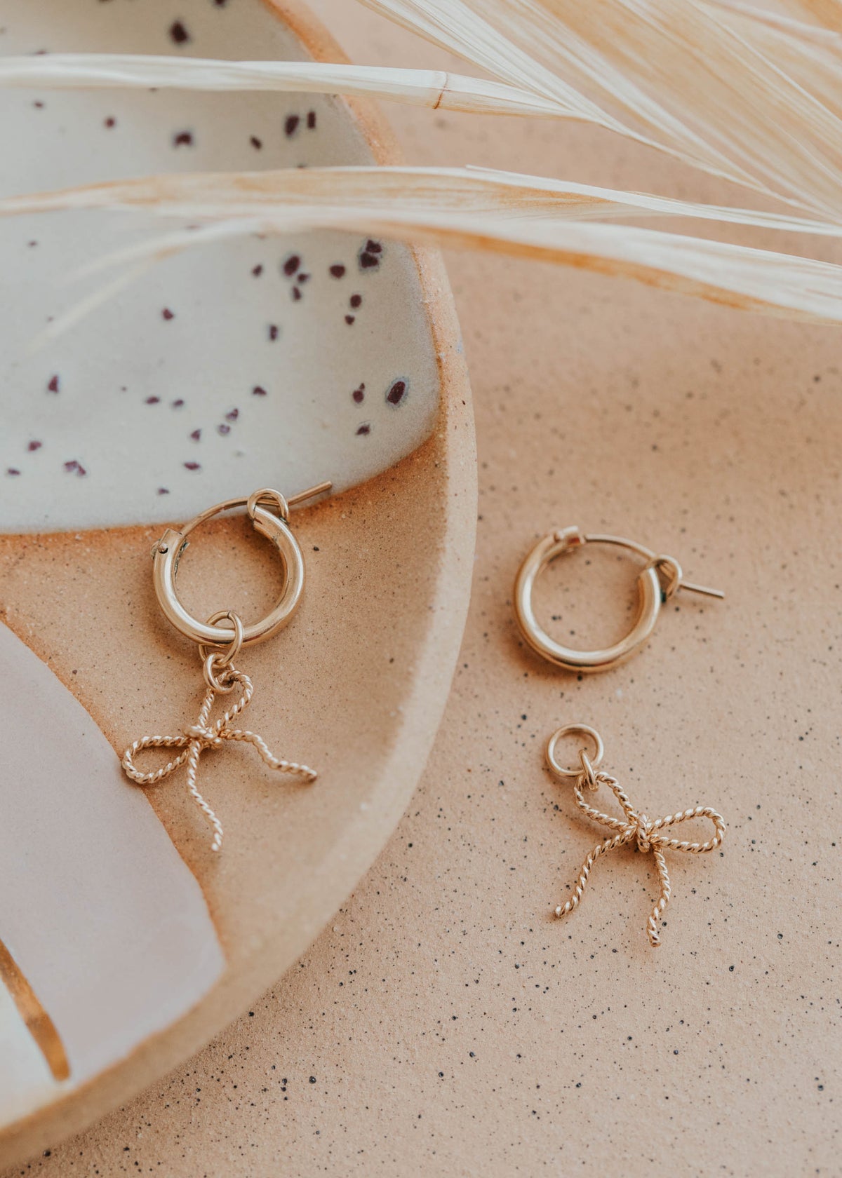 Adorable bow charms that dangle playfully from our favorite hoops, adding a sweet twist to your everyday earring stack.