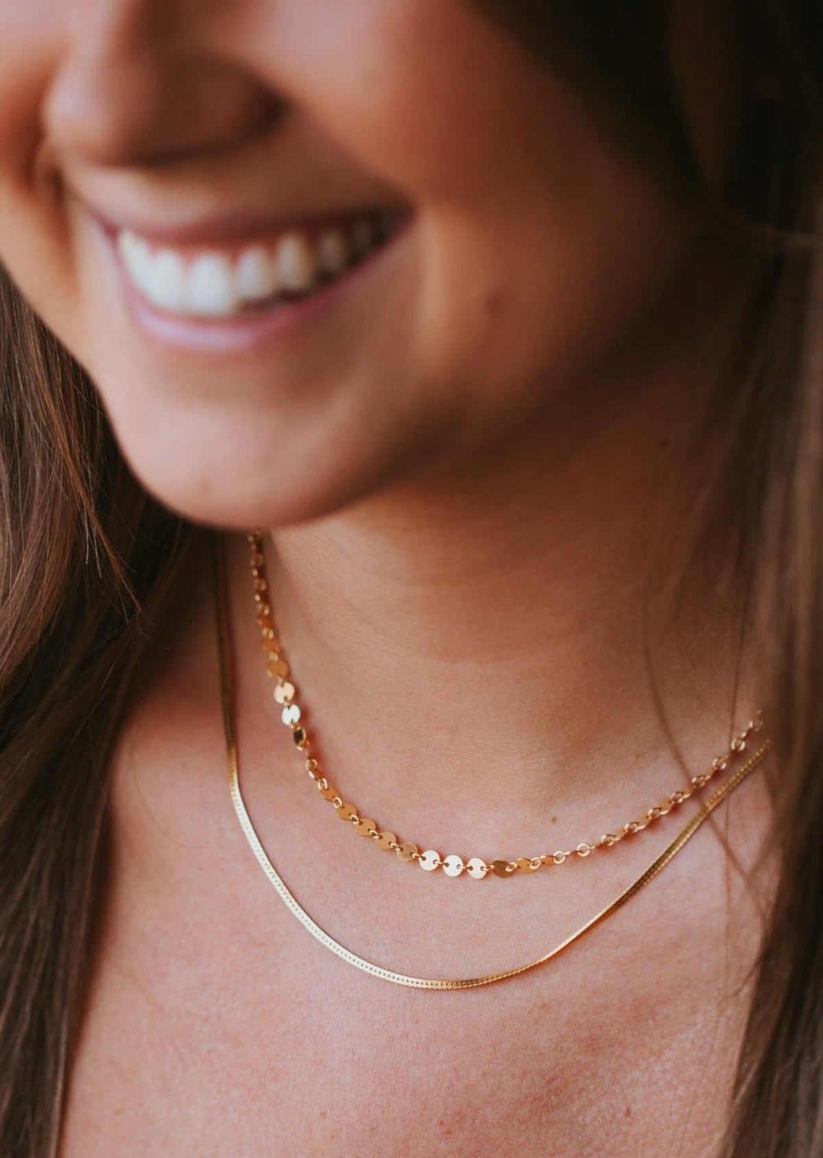 Most of our layering chains are available in both 16” and 18” lengths (check size options or description). Necklace lengths fit differently on each individual depending on height, body type, etc. To find your preferred length, take a piece of string, wrap it around your neck to the desired length, and measure that length using a ruler or measuring device.. Or check the length of a necklace you already own - measuring from end to end.
