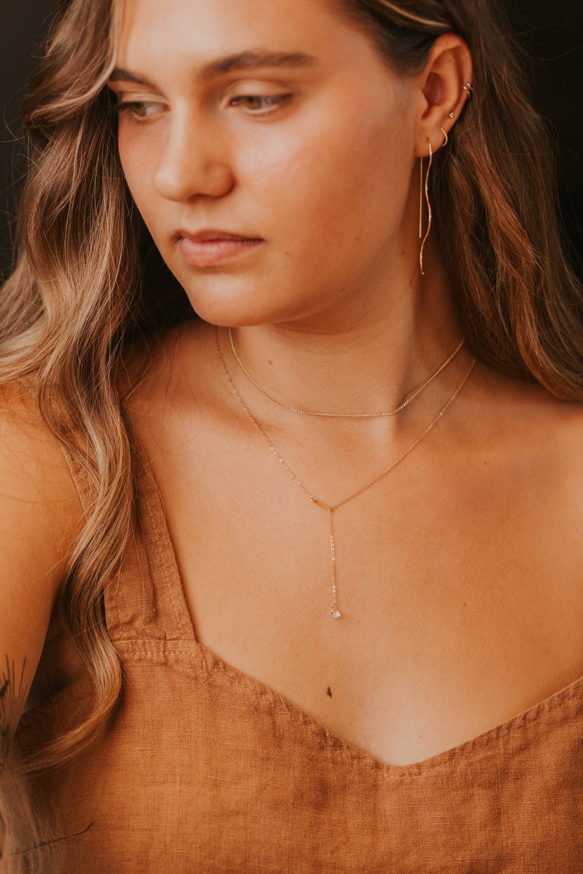 The Lana Lariat is here for any dressed up, or down, occasion. We've created a flawless lariat with Isla Chain threaded through a link from our Lana Chain and a suspending Herkimer stone. A sweet little sparkly treat for a cozy night in, or dazzling night out.