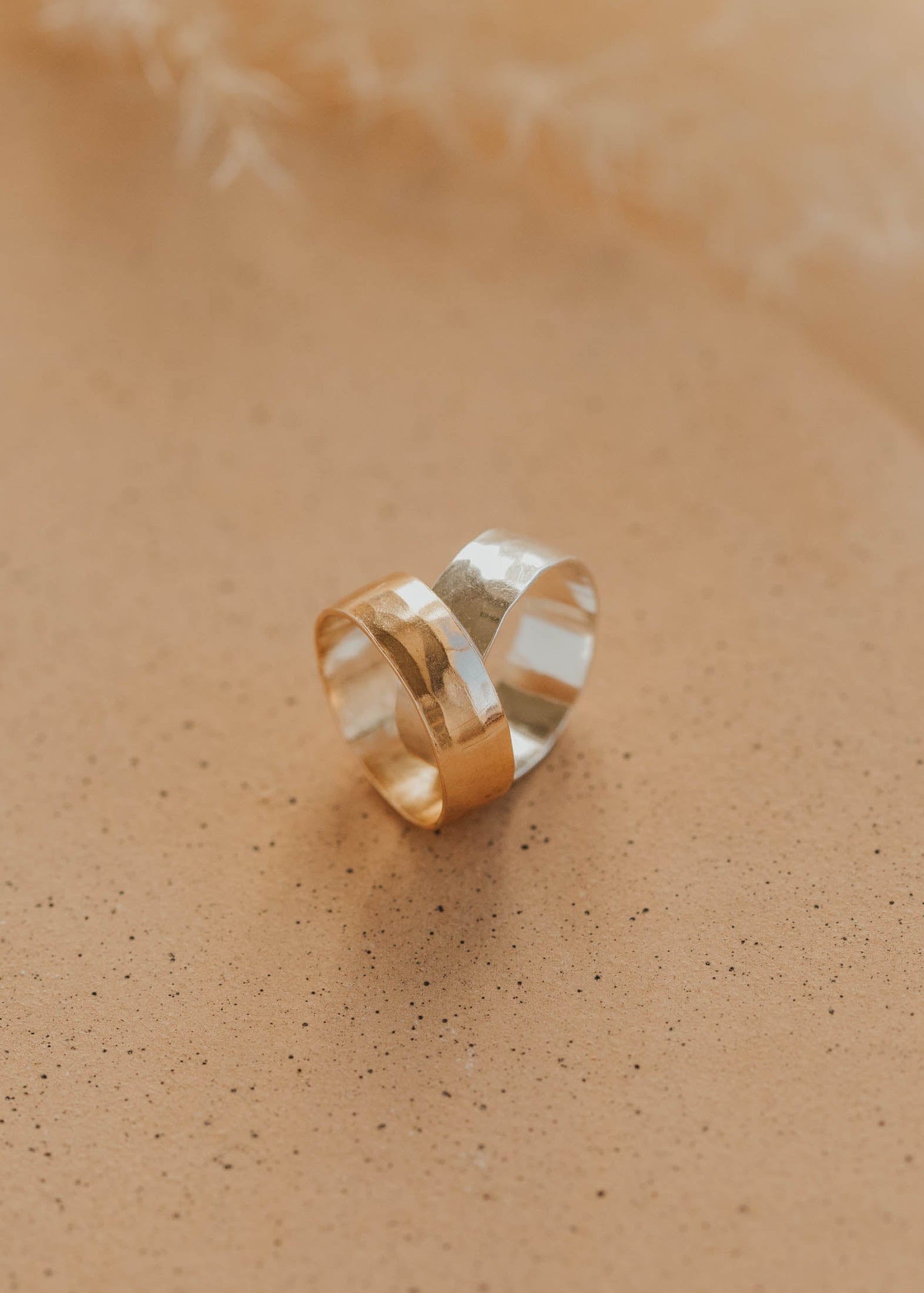 Our thickest, most statement-making band with a lightly hammered texture that catches the light. Bold enough to wear solo, beautiful stacked with other rings.