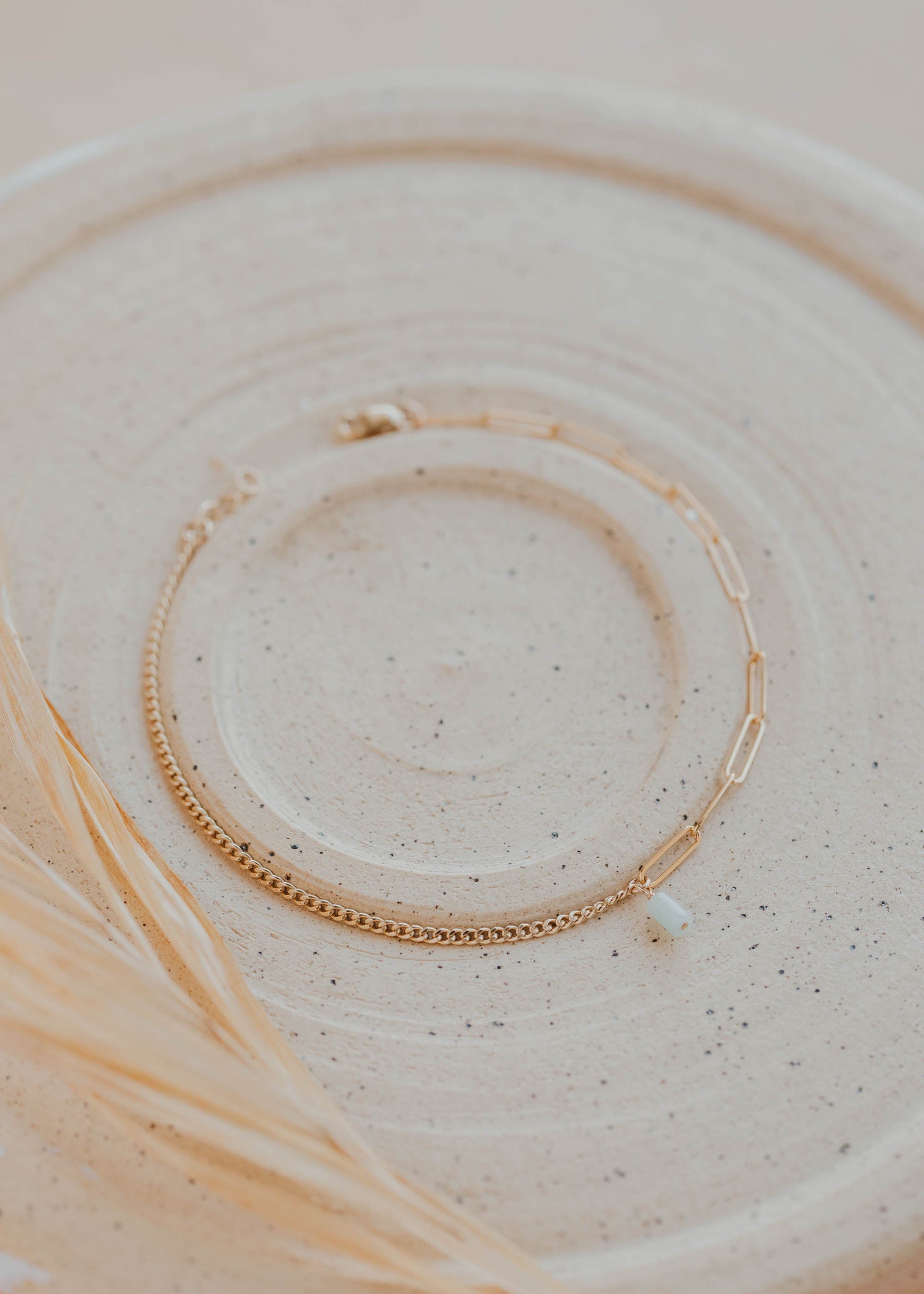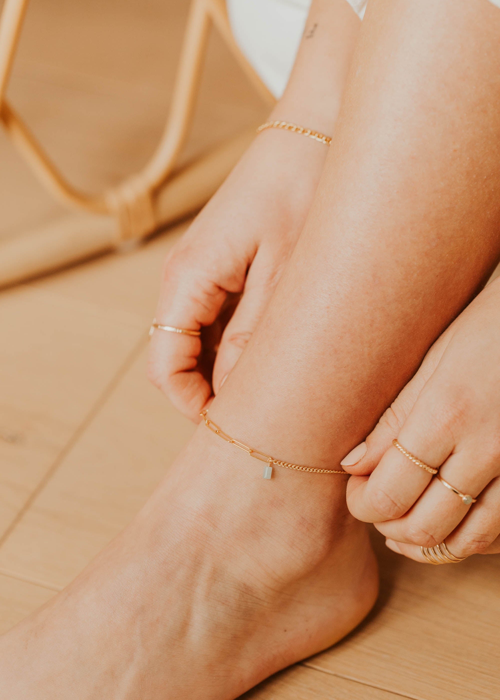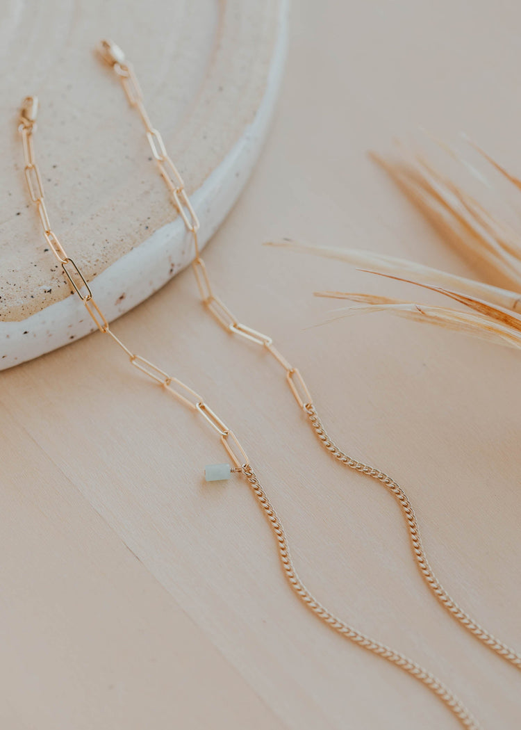 The Lana and Stevie Chains are combined to create an anklet of our (and your) dreams. Designed to catch the sunlight, and a perfect accent for beach days and beyond.