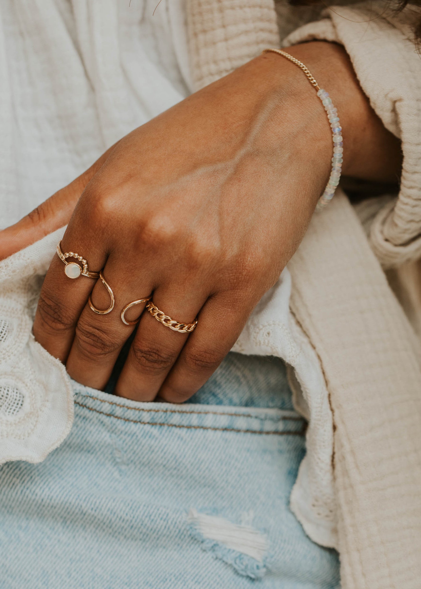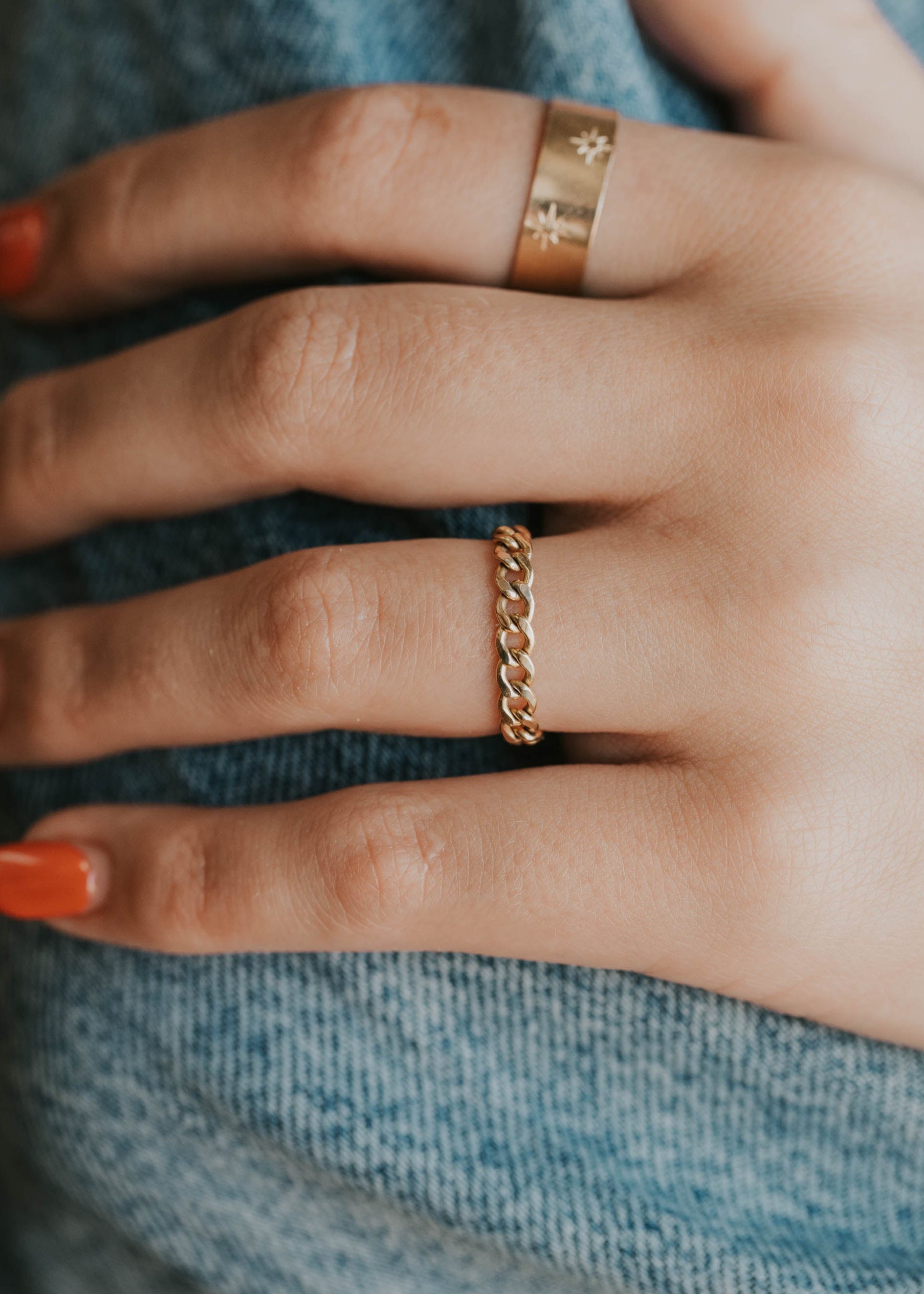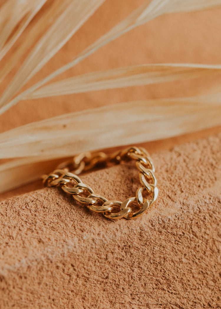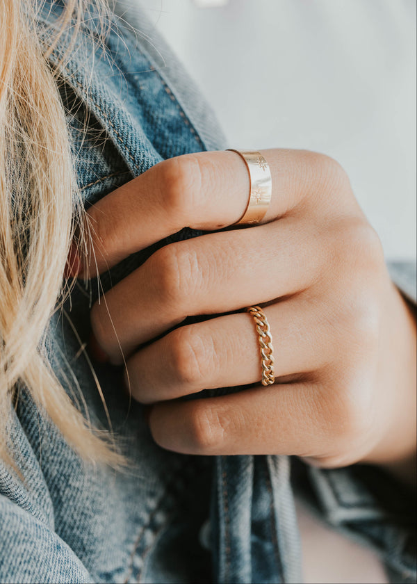 The Avery Chain Ring brings edge to your everyday stack with its fluid, high-shine links and unisex appeal. Wear it solo for a statement or layer it up - either way, it moves with you.
