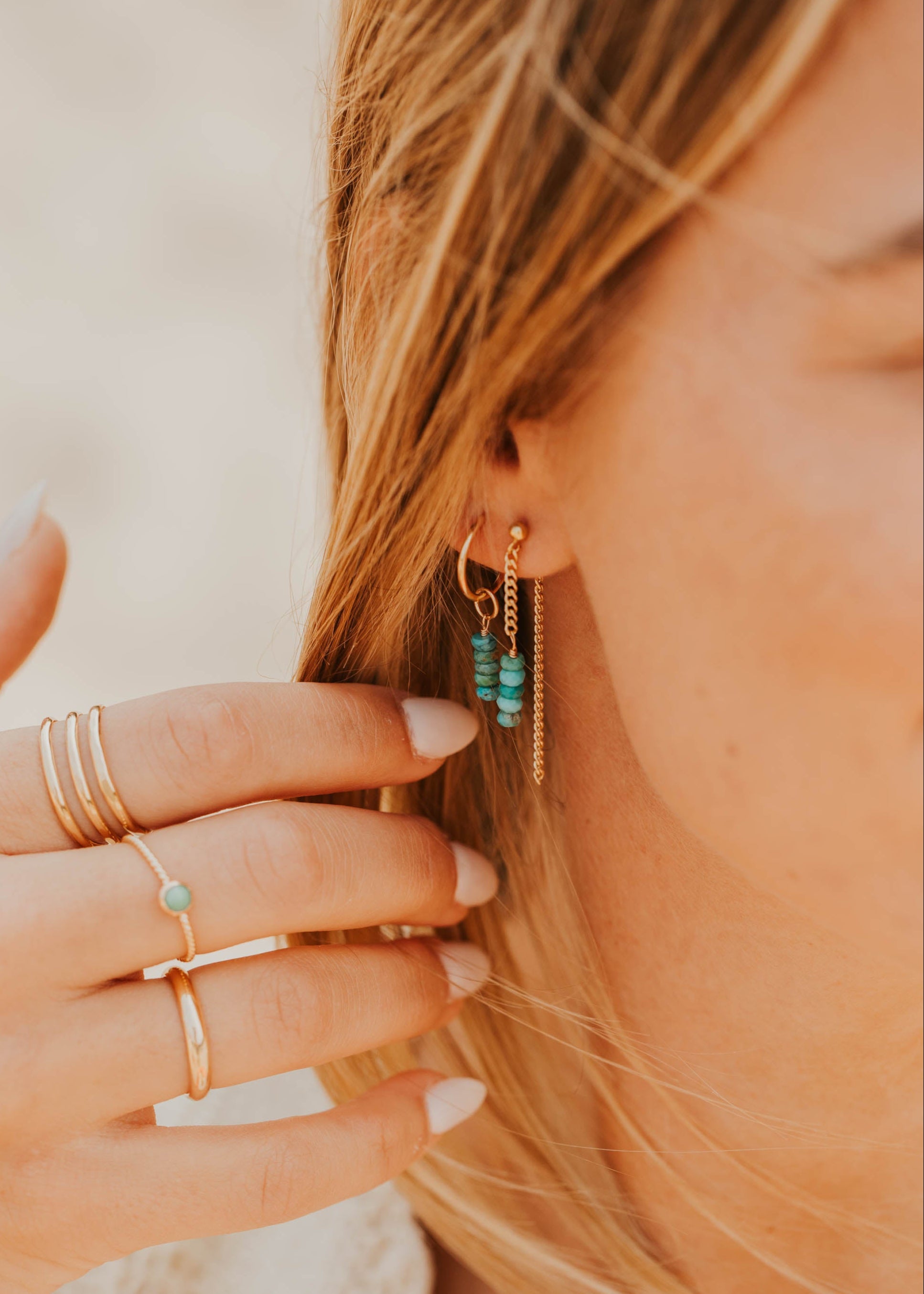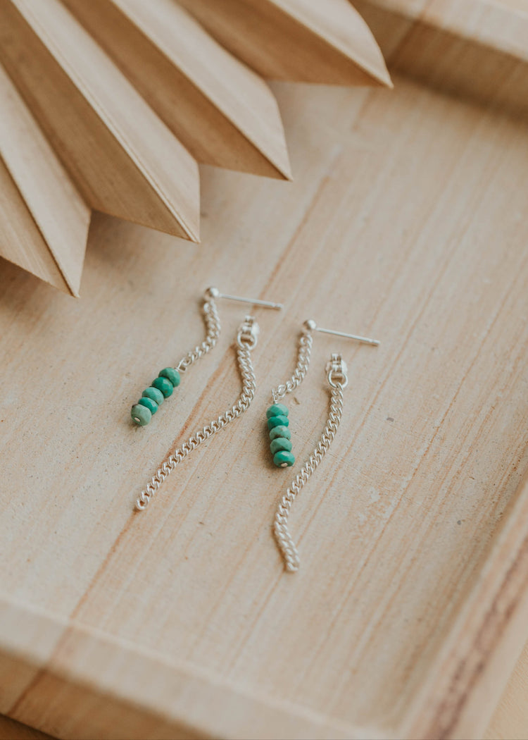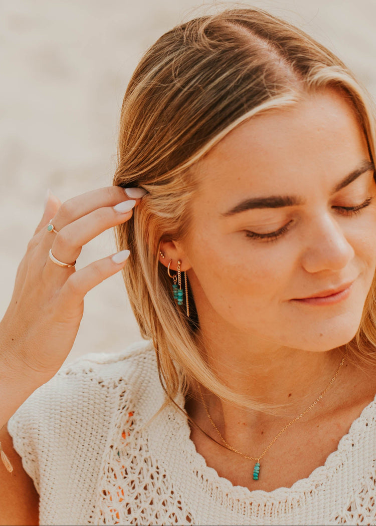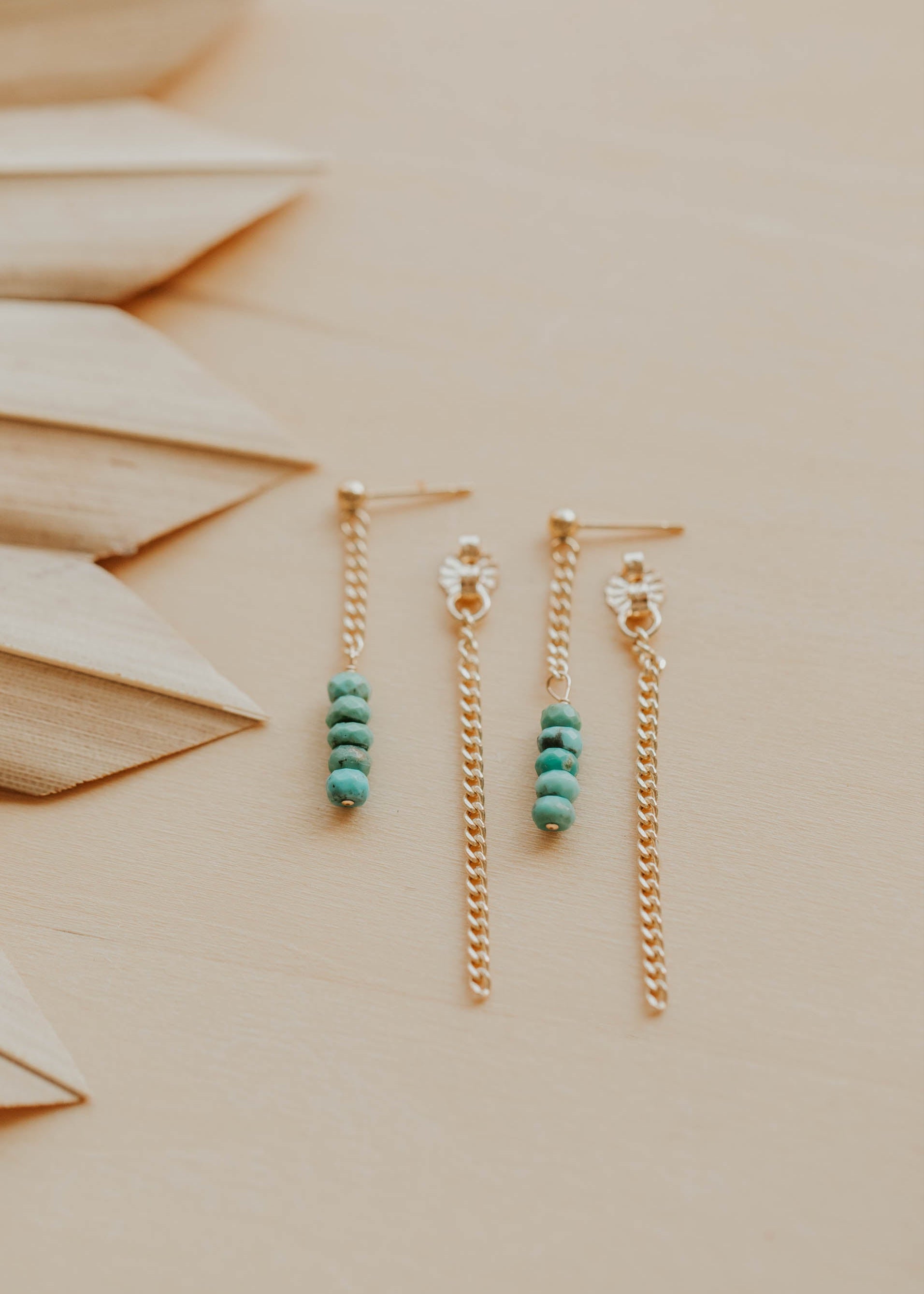 You know how we love our Backdrops. Now we're offering "drops" meaning you get a backdrop and a "front" drop in the same earring, creating movement and sparkle. Our Mara Drops are made with turquoise stones that catch the light like ocean waves.