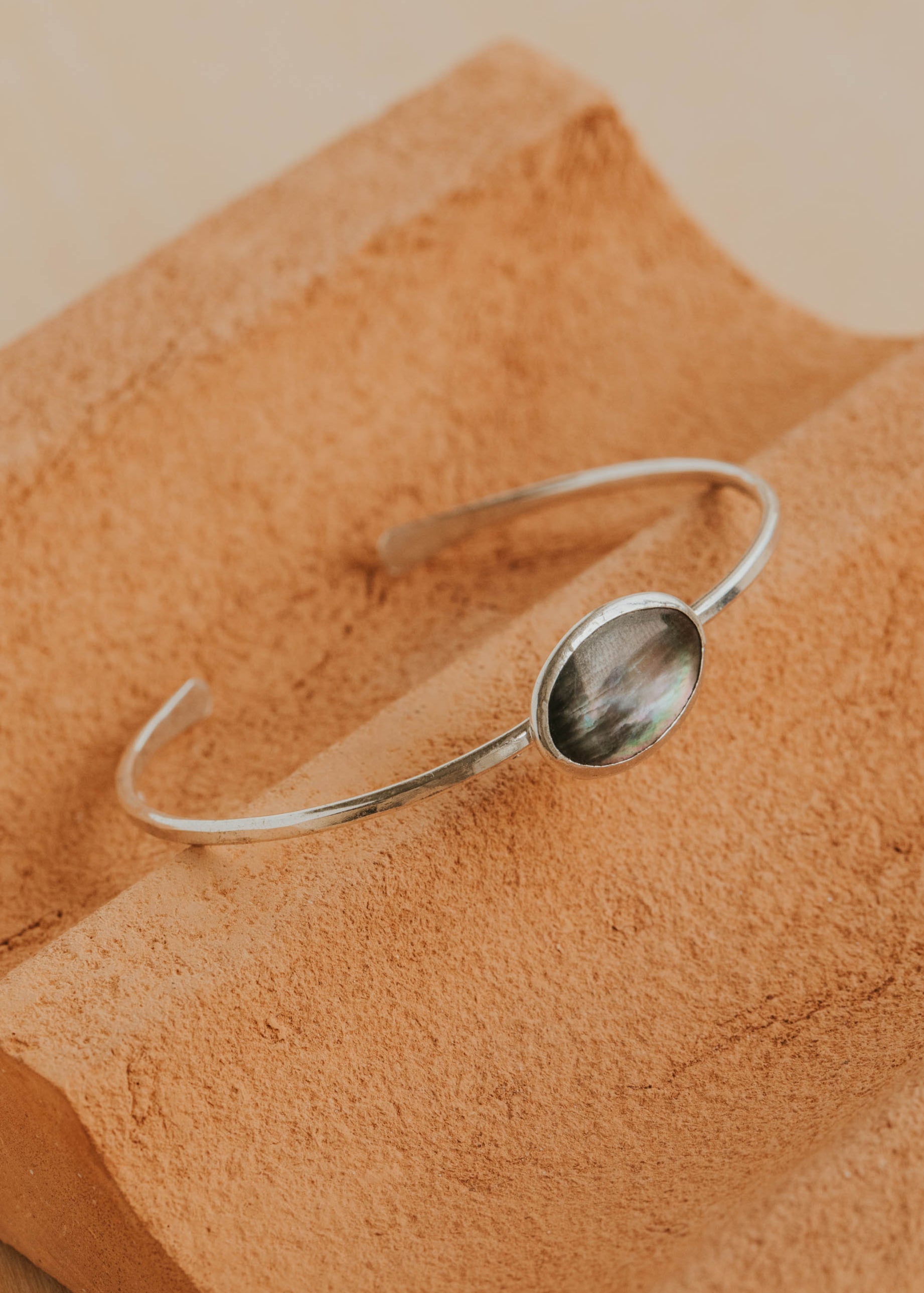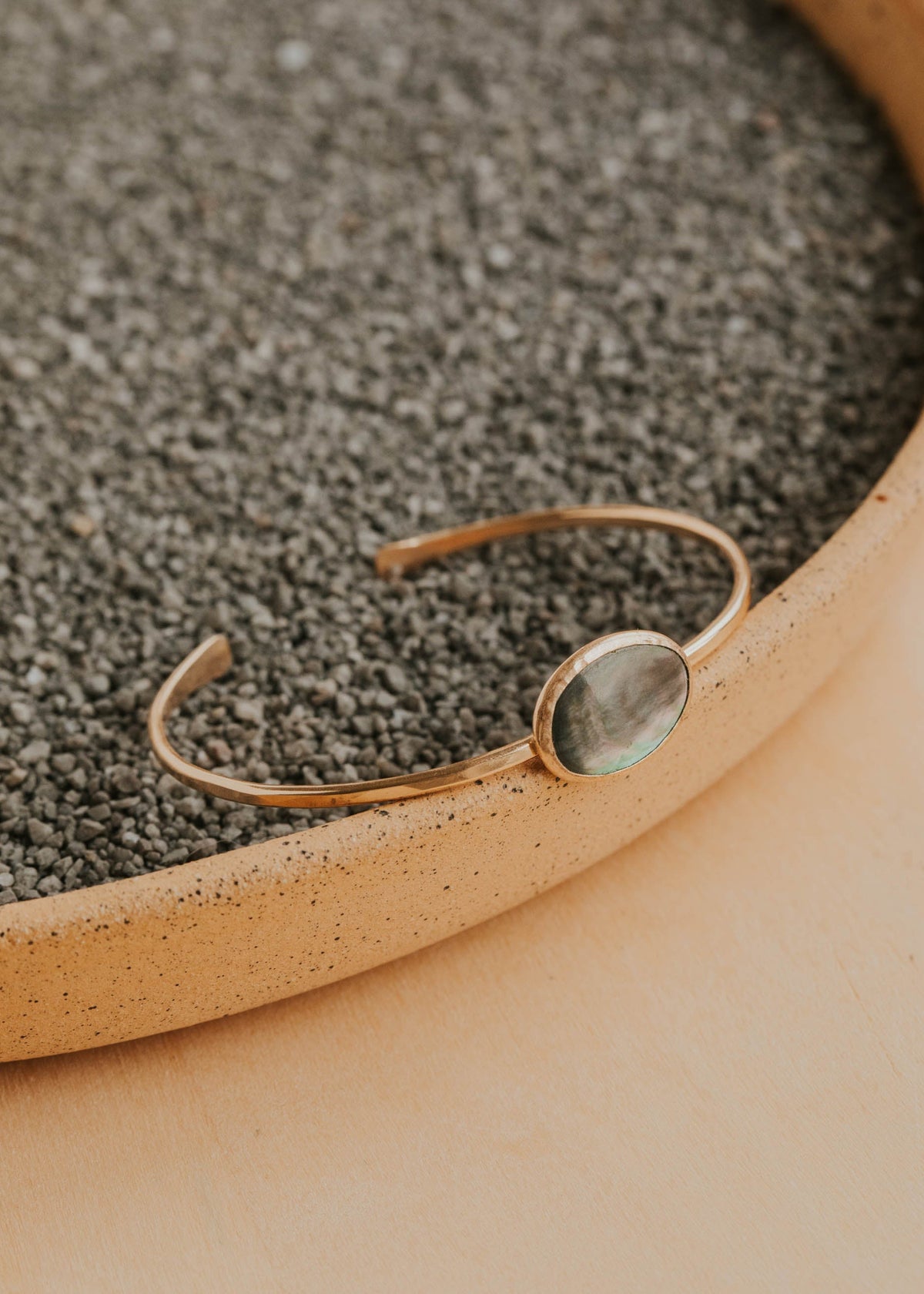 This handmade cuff is made with black Mother of Pearl bringing protective energy and a bold + mysterious vibe.