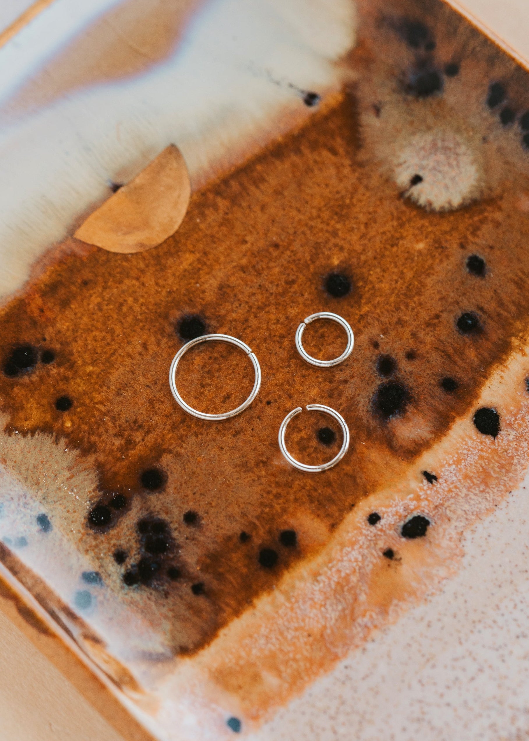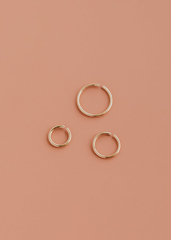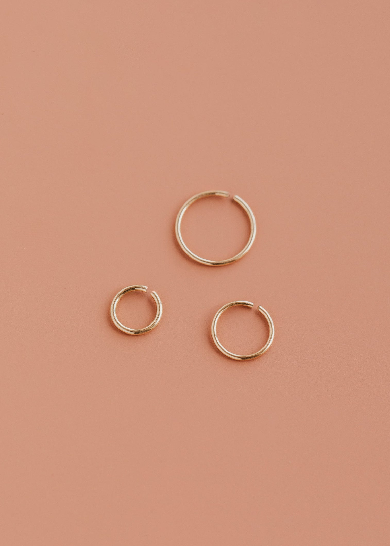 Available in 3 sizes: 5mm, 7mm, or 9mm diameter. Tips for putting them in: Open the ends (push one up, one down - never pull the ends apart to open the circle or you’ll misshape them). Thread into your piercing. Push ends back to flush and give a gentle pinch so they appear seamless.